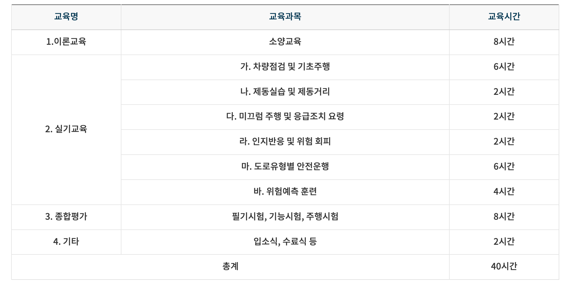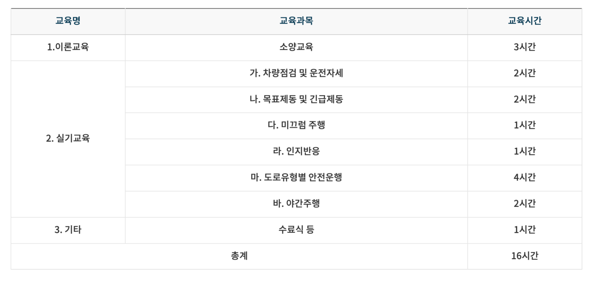 ✔️교육구성 (개인택시운송사업 면허의 양수요건 등 관련 교통안전교욱에 관한 고시 별표)